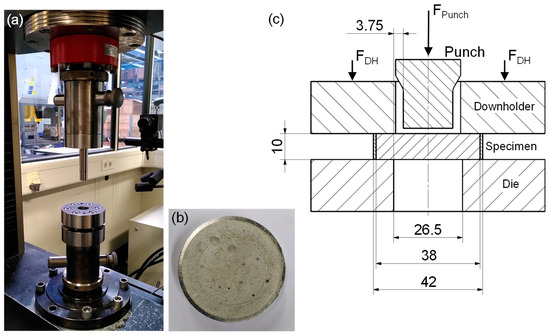 The push-out test setup consists of a punch, a downholder with guide bushing, and a die. A schematic of the push-out test setup with notable dimensions in mm is given in Figure 2c. The punch has rounded edges with a radius of 50 µm. The clearance between the punch and die runs 3.75 mm all around. The punch force FPunch acts centrally on the UHPC part of the specimen far from the steel ring. It is not the adhesion between the UHPC and the steel ring that is to be tested but the strength of the UHPC itself. The downholder screwed on the die keeps the specimen centered in place. The die also has rounded edges. The push-out test setup is mounted in the universal testing machine AllRound Line Z 150 by ZwickRoell GmbH & Co. KG, Ulm, Germany, as seen in Figure 2a. During testing, the punch moves down with 1 mm/min until fracture occurs. The universal testing machine records the corresponding force–displacement curves with a rate of 100 Hz giving a value approximately every 1.6 × 10−3 mm.