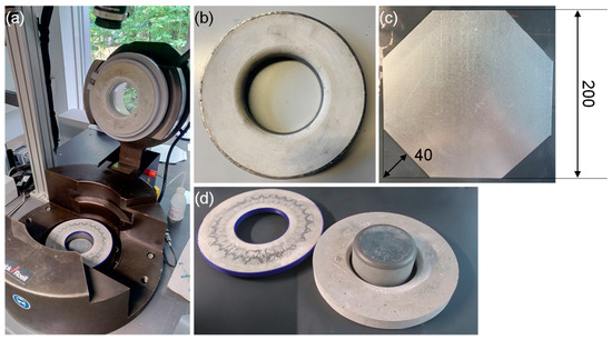 Setup for deep-drawing experiments. (a) UHPC-forming tools mounted on the sheet metal testing machine, (b) deep-drawing die made of UHPC in a restrained condition, (c) initial blank geometry, and (d) deep-drawing blankholder, punch, and die made of UHPC.