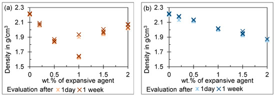 The results for the density of the specimens with expansive agent 1 in different additions are given in Figure 2a and in Figure 5b for expansive agent 2.