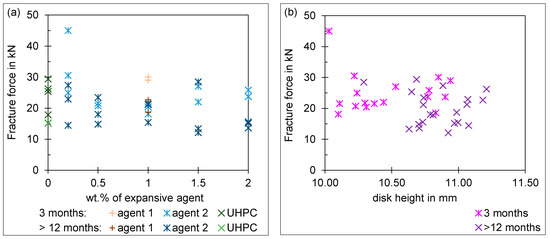 The fracture force of the tested push-out specimen is given in Figure 7a. The fracture force varies between 15 and 45 kN, while the punch travels between 0.3 and 0.6 mm before fracture. The height of the push-out specimen has no influence on the fracture force, as shown in Figure 7b. The same applies to the punch travel up to fracture; a later break does not result in a higher bearable force on the specimen. In addition, there is no major difference between UHPC specimens with or without an expansive agent. A higher addition of expansive agent 2 does not result in a higher fracture force. These trends are valid for specimens tested after 3 and 12 months. An aging effect of the specimens can be recognized. The fracture strength is lower after 12 months than after 3 months. However, the adhesion of the UHPC mixture in the steel ring improves in specimens made of expansive UHPC in a restrained condition. In these specimens, the cohesion of the steel ring and UHPC matrix remains intact even after fracture.