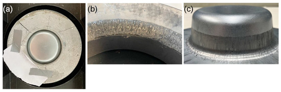 The deep-drawing die made of UHPC breaks after seven strokes at a forming force of 83.6 kN and a drawing depth of 25 mm. The die broke due to several complete cracks in a radial direction before the finish of the stroke, as shown in Figure 8a.