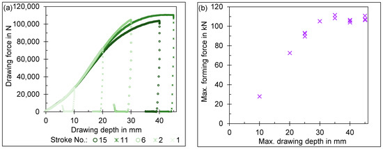 In the drawing experiments with the die made of expansive UHPC in a restrained condition, the maximum forming force increases with the drawing depth until the drawing depth reaches 35 mm. Above a drawing depth of 40 mm, the maximum forming force no longer increases with the drawing depth. This is clearly shown in Figure 9b. This can be attributed to the size of the sheet metal. With increasing drawing depth, the flange on which the clamping force acts becomes significantly smaller. The sheet now slides more easily into the drawing clearance and the drawing force no longer increases with the drawing depth from this point onwards. This can also be seen in the force–displacement curves in Figure 9a. The force–displacement curves also show that later drawing tests (shown in a darker shade of green) are shifted downwards compared to earlier drawing tests (a lighter shade of green). One reason for this is the increasing zinc layer on the drawing radius, which reduces the friction between the UHPC die and the sheet and thus the needed forming force [42,43,44]. On the other hand, the degradation of the drawing radius should be mentioned here. With increasing drawing radius, the forming force required for drawing the cup is reduced [45,46,47]. With increasing degradation of the drawing radius, the part quality and dimensional accuracy decrease, limiting the use of UHPC tools in industrial applications. More information about the wear of UHPC tools can be found in previous works [48].