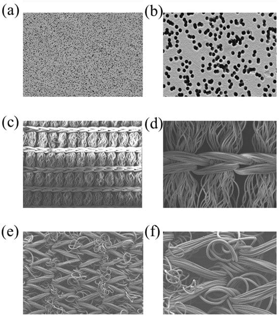 SEM picture of TE-PET supports: (a) 0.2 µm, (b) 1.0 µm; Cordura®: (c) magnification 50×, (d) magnification 200×; and elastane: (e) magnification 100×, (f) magnification; 1000×.