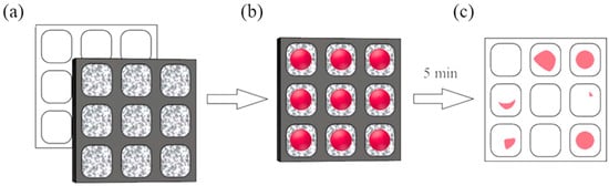 The obtained PDMS membranes were tested for permeability relative to liquid water in a simple laboratory procedure (Figure 2). The flat membranes were placed in a rack’s windows. In the next step, the rack was placed on a white sheet of paper. A betanin solution was applied to each of the tested membranes. The areas of the applied solution were determined. After 5 min, the rack was removed from the sheet of paper and traces from the red dye were observed. The tightness of the membrane was defined as the ratio of the area of the stain on the paper (AS) to the area of the dye applied to the membrane (AD).
