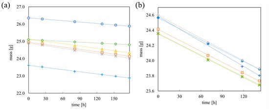 Weight loss of water in the glass vials capped with (a) PDMS/elastane membranes with different PDMS thicknesses: x—124 µm; ■—140 µm; +—170 µm; ▲—200 µm; ●—353 µm; ♦—426 µm. (b) PDMS/nylon 15 den membranes with different PDMS thicknesses: ●—0.0 µm; ■—2.7 µm; ♦—4.7 µm; ▲—6.1 µm; +—7.7 µm; x—9.9 µm.
