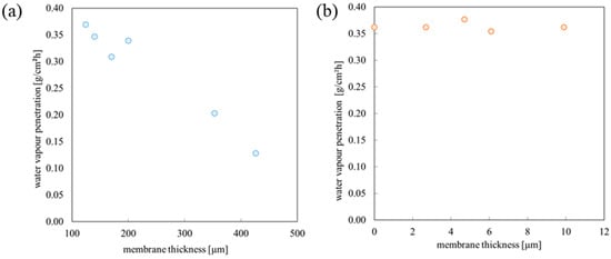 Water vapour permeability for membranes with different thicknesses: (a) PDMS/nylon 8 den; (b) PDMS/nylon 15 den.