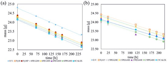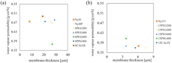 For the membranes supported via 8 den nylon, the permeability to water vapour was reduced only for the 8PEG600 membrane (Figure 8a). For the membranes modified with Calixarene, the permeability to water was even higher than for the undoped reinforced membrane itself. For the membrane supported with 15-denier nylon (Figure 8b), the addition of PPG400 increases the permeability to water. No significant change in permeation was observed for other admixtures. It is worth noting that the addition of PEG, PPG, or Calixarene has an influence on the water vapour permeability (WVP) value (Figure 8).