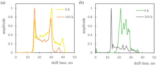 Drift time spectra obtained during membrane cleaning: (a) Nyl15; (b) 8PEG600.
