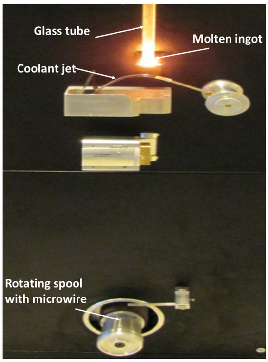 Essentially, the fabrication of glass-coated microwires involves melting a metal alloy ingot (typically a few grams) inside a glass (either Duran or Pyrex) tube using a high-frequency (usually 350–500 kHz) inductor heater, forming and drawing a glass capillary with the metallic alloy inside. The solidified glass-coated microwire is then captured by a rotating receiving bobbin. The manufacturing process sketch is shown in Figure 1. Rapid melt quenching, achieved by a coolant jet, allows us to obtain such glass-coated microwires with an amorphous structure [37,38].