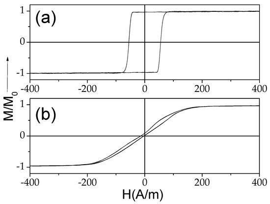 The hysteresis loops of both of the studied samples measured at room temperature are provided in Figure 2. A rectangular hysteresis loop with coercivity, Hc, about 60 A/m can be observed in the as-prepared Fe75B9Si12C4 sample (see Figure 2a), while an almost linear hysteresis loop with an order of magnitude lower than in the as-prepared Fe75B9Si12C4 sample Hc (about 8 A/m) is observed in the Co69.2Fe3.6Ni1B12.5Si11Mo1.5C1.2 sample at room T (see Figure 2b). Such characters of hysteresis loops and Hc values are typical for Fe-rich and Co-rich glass-coated microwires at room temperature with positive and vanishing λs values [38].