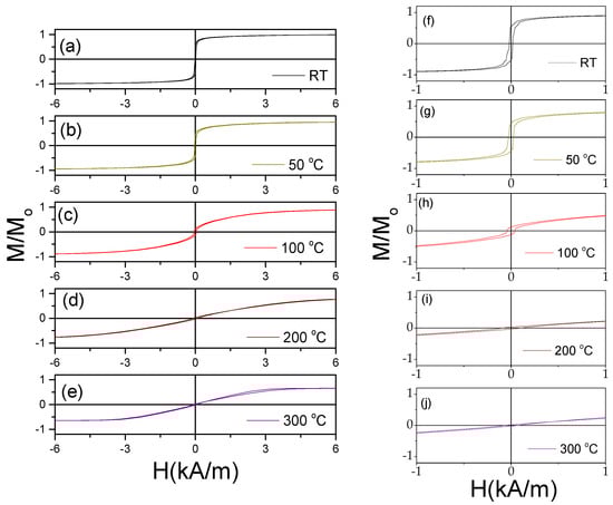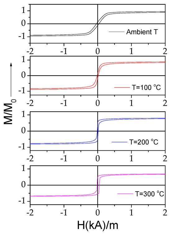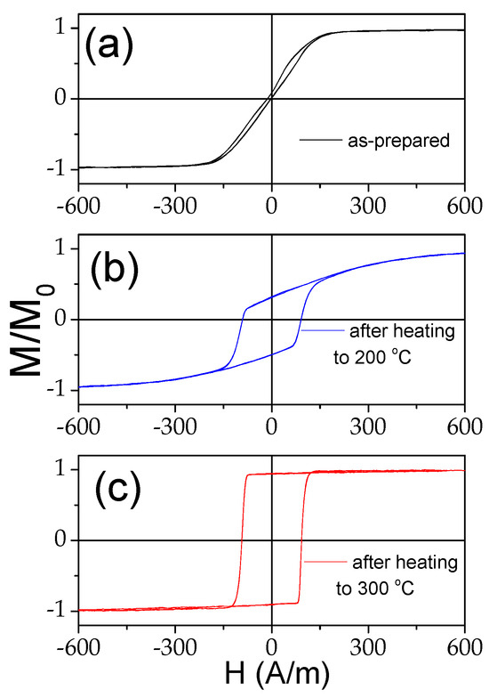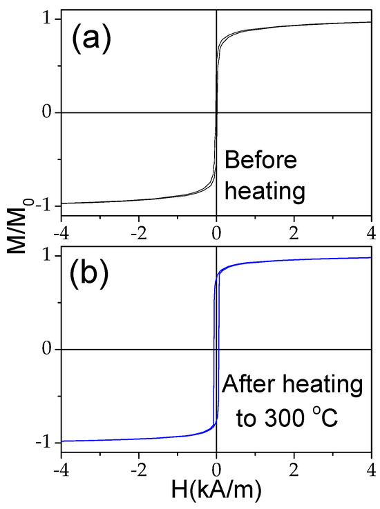 On the other hand, the hysteresis loop measured after heating to 300 °C and cooling to room temperature restores its rectangular shape (see Figure 5). Accordingly, the observed changes in the hysteresis loops upon heating are almost completely reversible.