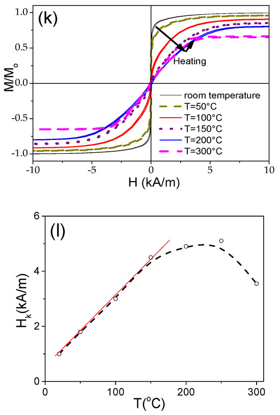 The temperature dependence of the hysteresis loops of Fe75B9Si12C4 is provided in Figure 3. A substantial hysteresis loops modification from rectangular into inclined upon heating is clearly seen (see Figure 3a–j). With increasing temperature, T, the hysteresis loop becomes more inclined. However, a change in this tendency is observed at T > 250 °C (see Figure 3d,e,k).