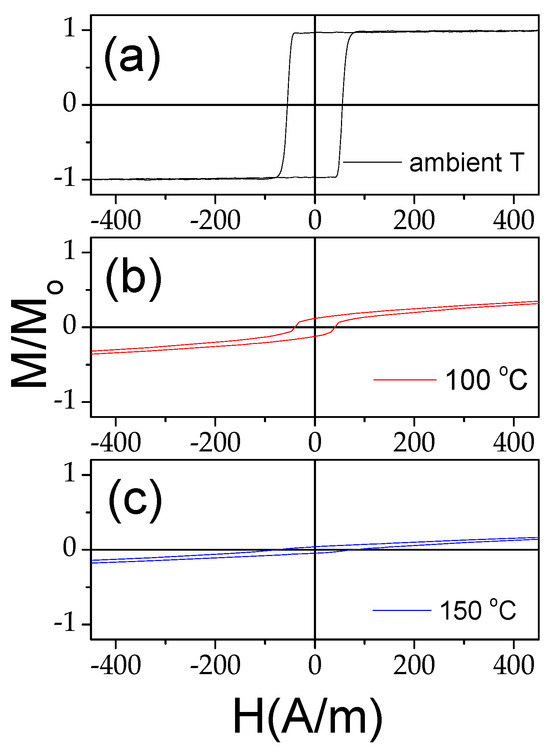 Hysteresis loops of Fe75B9Si12C4 sample measured at room T (a), at T = 100 °C (b), and at T = 150 °C (c).