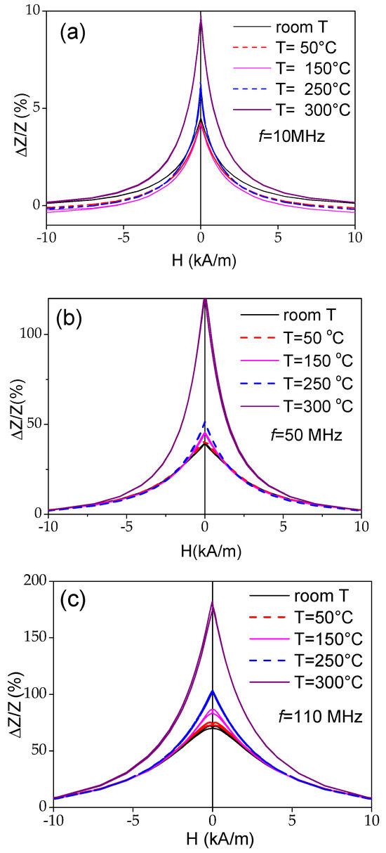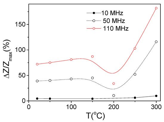 The temperature dependencies of ΔZ/Zmax evaluated from ΔZ/Z(H) dependencies measured at different T for 10, 50, and 110 MHz are summarized in Figure 7. From the ΔZ/Zmax(T) dependencies, an increase in ΔZ/Zmax at T ≥ 250 °C is clearly appreciated.
