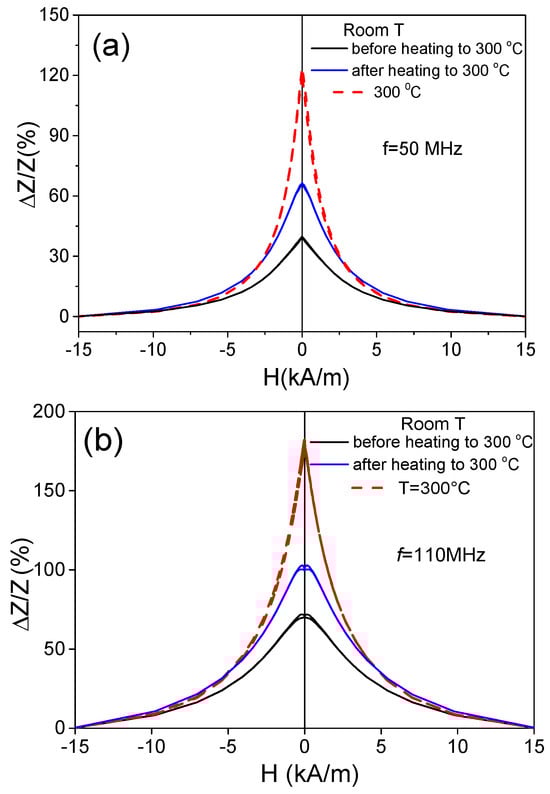 The attempt to separate the effect of heating from the effect of the internal stresses’ relaxation is provided in Figure 8, where the ΔZ/Z(H) dependencies measured at room temperature before and after heating up to 300 °C and at ΔZ/Z(H) dependencies measured at T = 300 °C are presented. Some increase in the ΔZ/Zmax value at room temperature after heating to 300 °C is evident from the provided ΔZ/Z(H) dependences (see Figure 8). The observed difference in ΔZ/Zmax at room temperature before and after heating to 300 °C must be associated with the relaxation of internal stresses. However, the main contribution to the increase in ΔZ/Zmax is related to the heating itself, since the ΔZ/Zmax values obtained at T = 300 °C are almost twice as high. This difference in ΔZ/Zmax is observed at various frequencies (see Figure 8a,b).