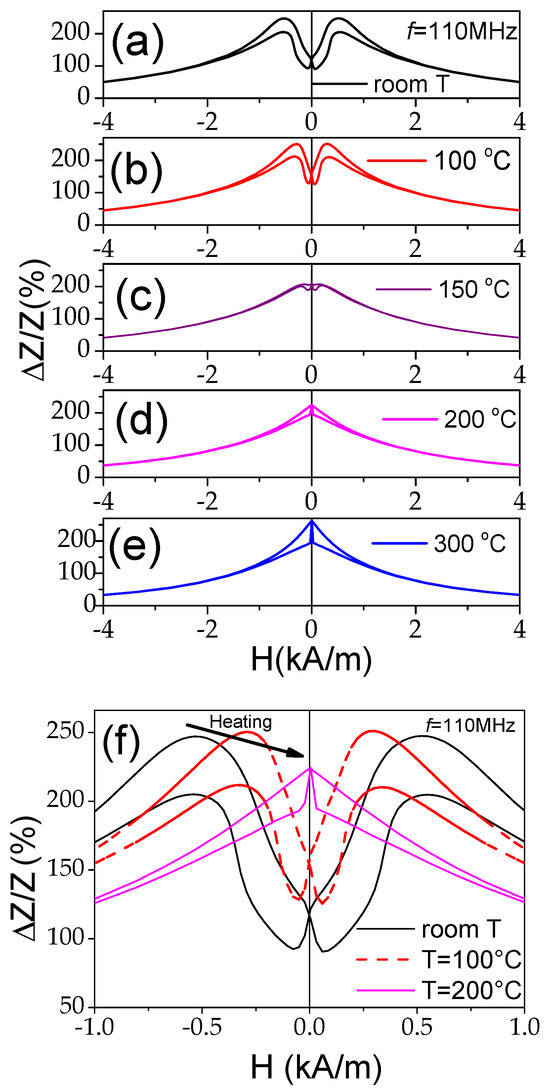 ΔZ/Z(H) dependencies measured at f = 110 MHz at room temperature (a), 100 °C (b), 150 °C (c), 200 °C (d), and 300 °C (e) and modification of the ΔZ/Z(H) dependencies measured at 110 MHz upon heating of Co69.2Fe3.6Ni1B12.5Si11Mo1.5C1.2 microwires (f).
