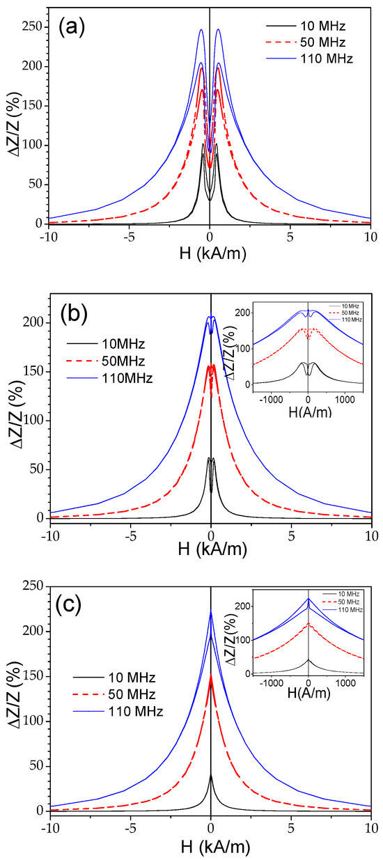 ΔZ/Z(H) dependencies of Co69.2Fe3.6Ni1B12.5Si11Mo1.5C1.2 sample measured at f = 110 MHz at T = 200 °C (a), T = 250 °C (b), and T= 300 °C (c).