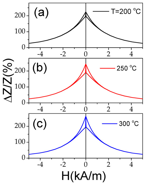 As discussed elsewhere [45,53], the ΔZ/Z magnitude and shape of ΔZ/Z(H) dependencies are related to the magnetic anisotropy of the magnetic wires. Therefore, one can expect changes in the ΔZ/Z value and ΔZ/Z(H) dependencies upon heating. As expected, the observed change in the magnetic anisotropy of Co69.2Fe3.6Ni1B12.5Si11Mo1.5C1.2 microwires correlates with the changes in the ΔZ/Z value and ΔZ/Z(H) dependencies. The effect of temperature on the ΔZ/Z(H) dependencies can be observed in Figure 10, where the ΔZ/Z(H) dependencies measured at different temperatures T are provided. As can be appreciated from Figure 10 and Figure 11, a gradual change from double-peak to single-peak ΔZ/Z(H) dependence takes place upon heating at 150 ≤ T ≤ 200 °C (see Figure 10). Thus, at T = 150 °C, a double peak ΔZ/Z(H) dependence can still be observed for all the frequencies (see Figure 11b). However, as compared to the ΔZ/Z(H) dependence measured at room T, the magnetic field of ΔZ/Z(H) maximum Hm becomes smaller. Finally, at T ≥ 200 °C, single-peak ΔZ/Z(H) dependencies are observed for all f values (see Figure 11c).