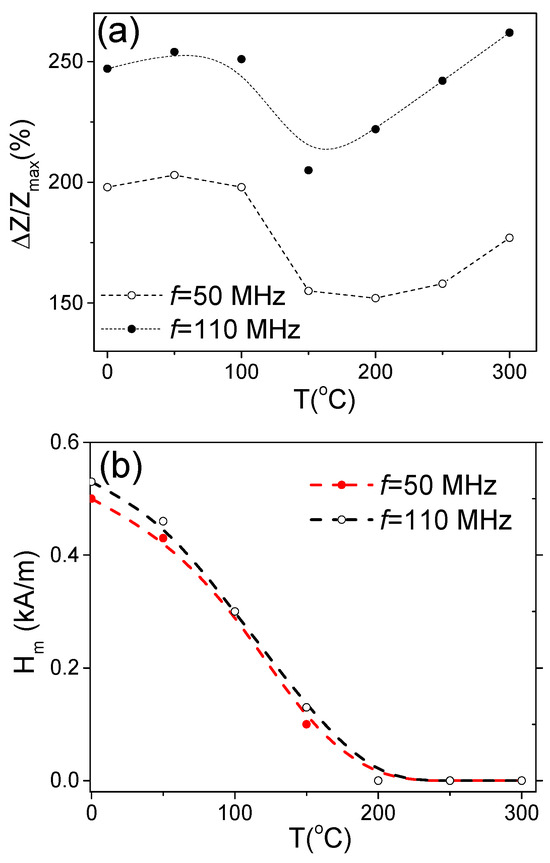 The aforementioned features of the ΔZ/Z(H) dependencies are summarized in Figure 13, where the dependencies of ΔZ/Zmax and Hm versus temperature are provided. A decrease in ΔZ/Zmax values between 150 and 200 °C is followed by an increase in ΔZ/Zmax values at T ≥ 250 °C (see Figure 13a). Generally, a decrease in ΔZ/Zmax values can be associated with the lower magnetic permeability of microwires with rectangular hysteresis loops. Typically, a lower GMI effect is reported elsewhere for magnetic wires with rectangular hysteresis loops [46,52]. However, the ΔZ/Zmax values obtained at T = 300 °C (for f = 110 MHz) are even higher than for room T (see Figure 13). Accordingly, similarly to that discussed above for the case of Fe-rich microwires, an increase in ΔZ/Zmax values at T ≥ 250 °C can be attributed to the Hopkinson effect. Such an interpretation looks reasonable, since the Curie temperature Tc of the studied Co69.2Fe3.6Ni1B12.5Si11Mo1.5C1.2 sample is about 325 °C [54,55].