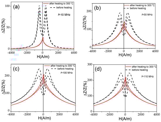 ΔZ/Z(H) dependencies measured at f = 10 MHz (a), 50 MHz (b), 100 MHz (c), and 110 MHz (d) in Co69.2Fe3.6Ni1B12.5Si11Mo1.5C1.2 sample before and after heating to 300 °C.
