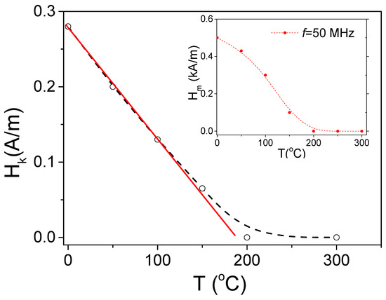 Similarly to what is provided in Figure 3l for the Fe75B9Si12C4 sample, we tried to evaluate Hk(T) dependence for the Co69.2Fe3.6Ni1B12.5Si11Mo1.5C1.2 sample from the hysteresis loops shown in Figure 9. As can be appreciated from Figure 16, a linear Hk(T) dependence can be roughly observed for T ≤ 150 °C. It is worth noting that the same tendency (linear Hk(T) dependence) is observed for the Fe75B9Si12C4 sample at the same temperature range (see Figure 3l). Therefore, we can propose the following interpretation for the observed temperature dependencies of hysteresis loops and the GMI ratio in both of the studied samples: