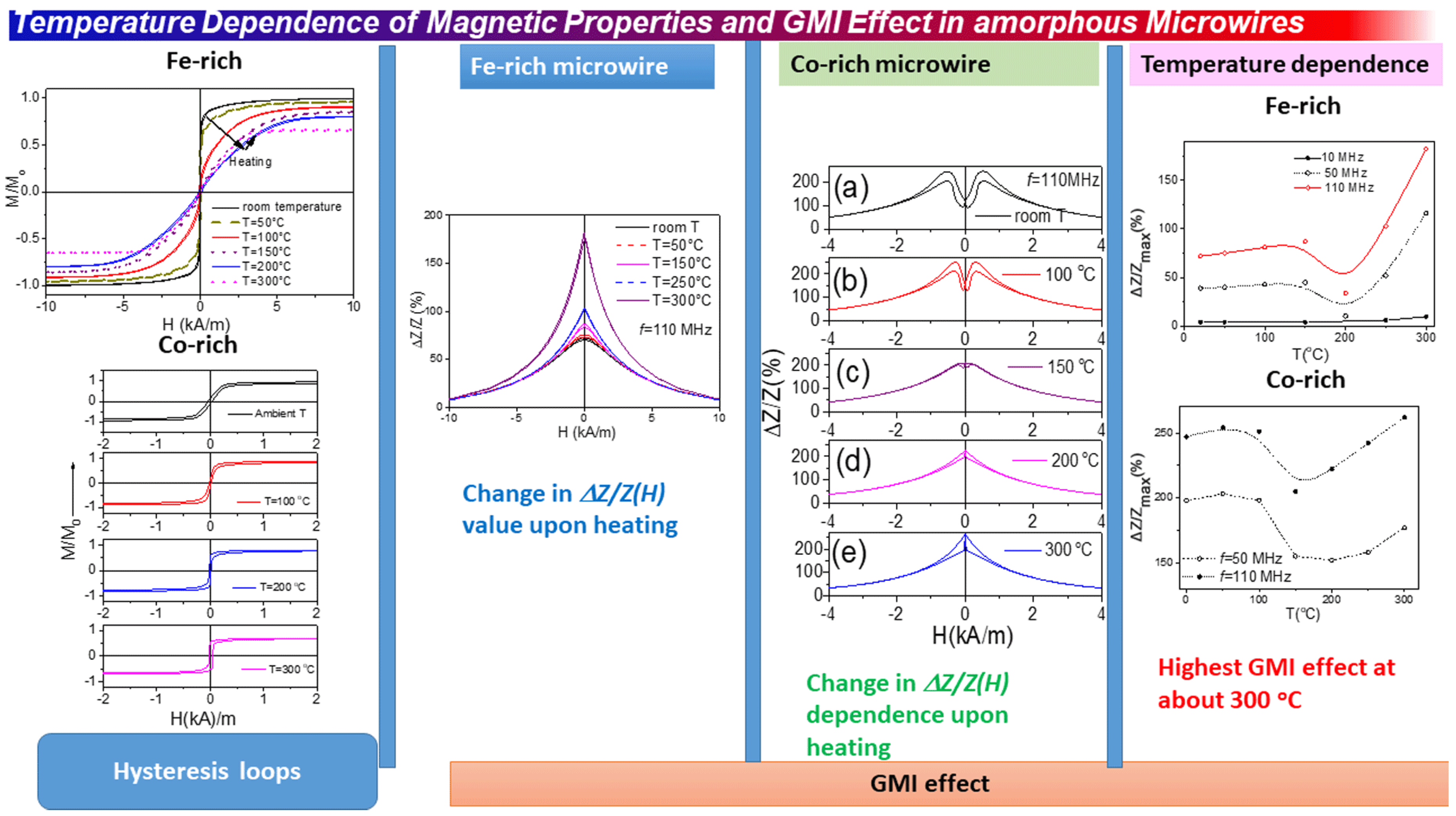 Recently, we studied the effect of heating on hysteresis loops and the GMI effect in Fe-rich glass-coated microwires in the temperature range from room temperature up to 300 °C and observed a substantial effect of temperature [35,36].