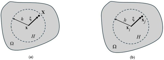 The discrete form of Equation (2) is illustrated in Figure 1b. The summation is performed over the subdomain H considering k points xj. The subdomain H is of the volume Vj in the 3D case. Then, the summation is performed over n points in the domain Ω. The equation reads as follows: