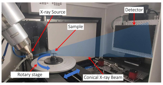The device comprises an X-ray source generating a cone beam on one end and a flat panel X-ray detector on the other. The sample is placed on a high-precision rotary stage between the source and detector, which can move farther or closer to the X-ray source. During the scan, the object is rotated slowly over 360°, and the detector captures several thousand perspectives of the sample.