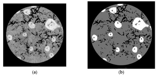 Example of a cross-section, mid-height of the sample: 3D volume filtered with non-local means filter, cross-section (a); segmented volume with 2 phases of the composite sample (b).