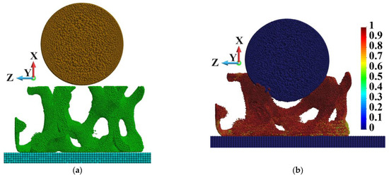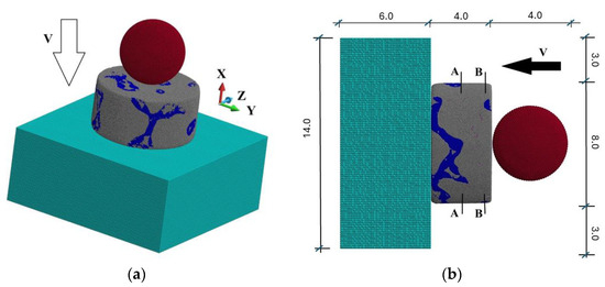 The skeleton is made of ceramic SiC material [78]. The material properties of the elastic brittle skeleton are as follows: Young’s modulus is 409.9 GPa, mass density is 3200 kg/m3, and Poisson’s ratio is 0.16. Fracture toughness is assumed to be 3.8 MPaxm1/2. The ecr is 4.234 × 10−4. The elastic–plastic aluminum alloy (AlSi12) matrix has the following material properties: Young’s modulus is 67.0 GPa, mass density is 2700 kg/m3, Poisson’s ratio is 0.35, yield limit is 100.0 MPa, and hardening modulus is 1.25 GPa [50]. Based on the derived from CT models, the porosity is 7.9%. The porosity value appeared during the fabrication process of the sample. The base and the impactor are steel with the following elastic properties: Young’s modulus is 210 GPa, mass density is 7850 kg/m3, and Poisson’s ratio is 0.3. Aiming to find the influence of porosity, the numerical model undergoes simplifications, assuming the elastic properties of the impactor and the base only.