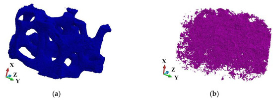 Since two structure cases are analyzed, two discretizations of the sample are required. In the ideal sample, the matrix counts 4,171,594 volumes and the skeleton 541,273. In the porous sample, the matrix is discretized with 3,570,571 volumes. The skeleton possesses the same number of volumes as in the ideal sample. Both models have the same base and impactor discretizations, namely 500,000 and 277,247 volumes, respectively. The number of volumes arises from applying the tetrahedra discretization of complex shape structures. In particular, the existence of pores, of which the cloud is shown in Figure 8b, forces such a discretization to obtain compatible perfect and imperfect geometries. A system of pores in the matrix is shown in Figure 9a, and the pores are presented in Figure 9b.