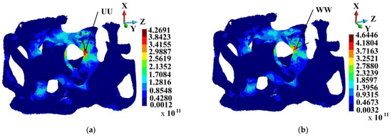 In general, porosity in the matrix does not affect the skeleton very strongly. Figure 10 shows the Huber–Mises–Hencky stress distribution in the skeleton. The stress distribution in the skeletons of the ideal and porous matrices are very similar. The maximum HMH stress in the skeletons appears in Points UU and WW, which lie in the same surroundings. The maximum HMH stress is higher in Point WW than in Point UU by 8.1%.