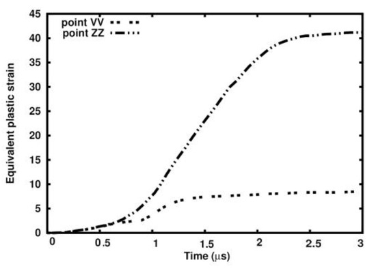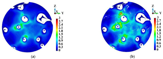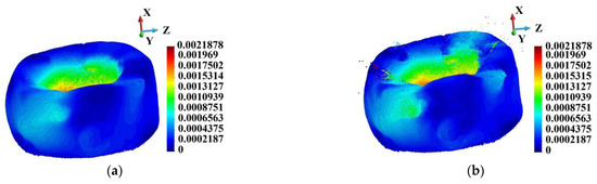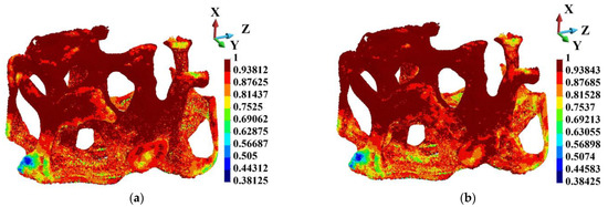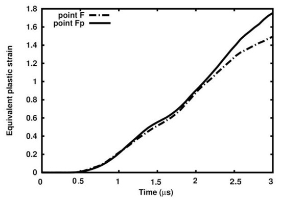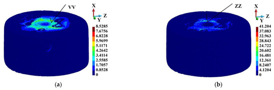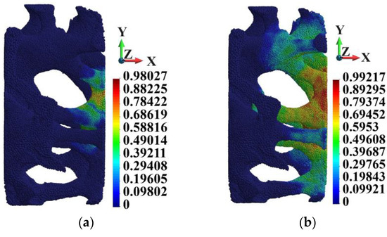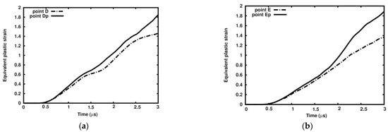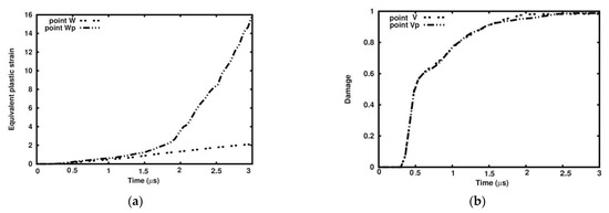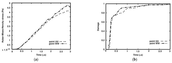 Figure 11 shows the damage variable field patterns in the skeletons, which are practically the same. In both cases, the skeletons’ structures are almost damaged. The comparison of HMH stress at Points UU and WW shown in Figure 12a indicates that the curves follow the path up to 2.0 µs. Then, the difference starts to become visible, growing to the above-mentioned 8.1% at the end of the process.