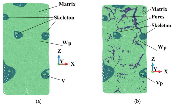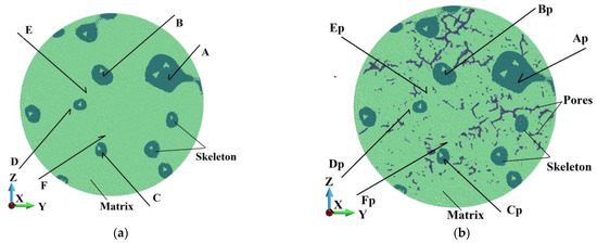 This section presents a detailed analysis of damage development in the SiC skeleton. It attempts to evaluate the skeleton’s behavior by comparing a fabricated aluminum alloy matrix with the porous one, as shown in Figure 8 and Figure 9.