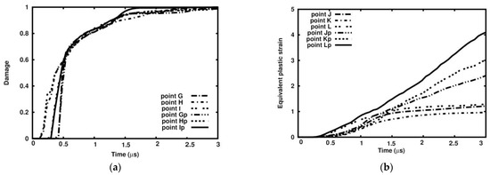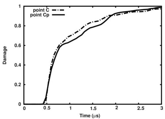 Regarding the damage variability at Points UU and WW, it can be noted that the curves grow along the same path steeply up to 0.25 µs. Then, the damage parameter grows slower at Point UU (ideal matrix case) than at Point WW up to 1.0 µs. Further, the curves meet and follow the same path up to 3.0 µs (Figure 12b).