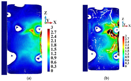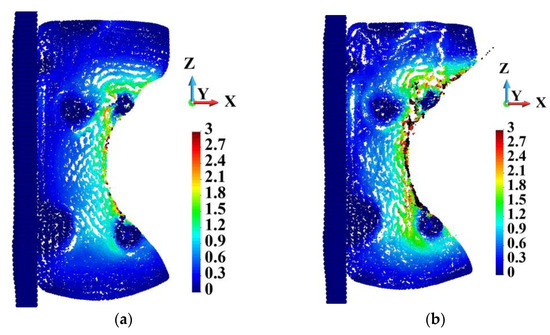 The simulations are performed using the Peridigm program [70,79]. The explicit time integration technique is applied. The process is followed up to 3 µs with a time step of 1.0 × 10−5 µs. The chosen time step is well below the initial stable time step 8.85 ns. The solution is obtained in 30,000 steps. The horizon value is taken as 0.0003 m. A general contact algorithm with a penalty number 1.0 × 1012 has been applied. The program is built on a Linux computer cluster with Intel(R) Xeon(R) Platinum 8268 CPU @ 2.90 GHz processors. Each processor has 48 cores and 192 GB memory. The solutions were obtained using 40 processors. The production runs took about 43,000 s, slightly varying due to the current loading of the machine.