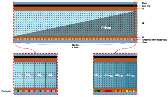 In order to achieve various diffraction angles, the optical phase profile, which is formed according to the birefringence of the LC, must be changed in real time. For this, various voltages must be applied to the individual electrodes on the bottom of the BD and a driving module with 720 channels is designed to independently operate each patterned electrode. Figure 1 depicts the structure of a BD with indium tin oxide (ITO) electrodes and LC for the birefringence changes [29]. The minimum measurement width, critical dimension, can be reduced to 0.5 µm by the optimization in the stepper process, and the patterned ITO electrodes on the lower substrate, having a width of 1.5 µm with a space of 0.5 µm, were fabricated. Different voltages are applied to each electrode, which alters the alignment angle of the LC. The degree of tilting in the LC changes its birefringence. The birefringence (∆n) is determined as the difference between the effective refractive index ) of the LC at a specific tilt angle (θ) and the ordinary refractive index (). The effective refractive index () depends on the orientation of the LC molecules relative to the applied electric field and is described by the following Equation: