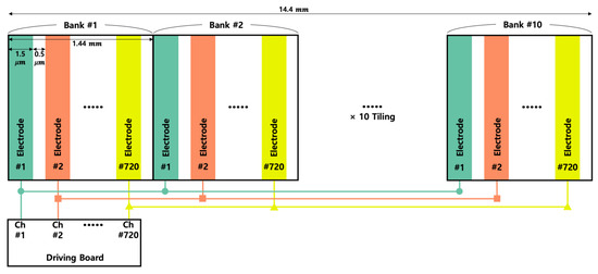 The BD has been introduced for compact system and researched and developed for and eye-tracking system in holographic display [30]; however, there is a need for the development of devices with larger viewing angles. For this reason, the patterned ITO with a smaller pitch must be implemented by the use of a reduction stepper (step and repeat projector) process [21,31,32,33]; however, while the pitch decreases, the total size of the active area is decreased due to the limited number of channels. This can be improved by the introduction of a periodic tiling process, and the active area is expanded by repeating the unit bank [29]. When a total of 720 electrodes are grouped into a unit bank and repeated 10 times, the active area of only 1.44 mm at a 2 µm pitch patterns can be increased to 14.4 mm, as shown in Figure 2. If a specific voltage is applied to the channel #1, the same voltages are transferred to each channel #1 of 10 unit banks since the same channels of each unit bank are connected to each other through the via-hole process. Similarly, the same voltage is transmitted to channel #2 of all 10 unit banks. In this way, the same voltage is transmitted to the electrodes with the same sequence number across all 10 unit banks.