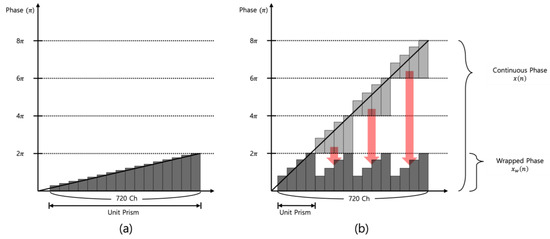 The concept of continuous phase and wrapped phase. (a) represents the case where the unit prism is 1, and (b) represents the case where the unit prism is 4. Furthermore, the red arrow illustrates the concept of a phase exceeding 2π being wrapped down to within the 0~2π range.