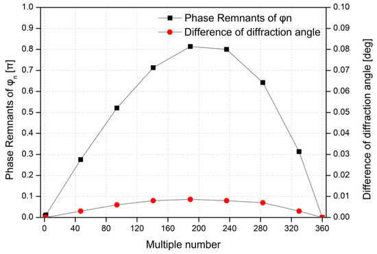 Phase remnants of and difference in diffraction angles between θ(n) and as a function of multiple number at the wavelength of 532 nm.