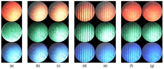 CCD images of diffraction patterns obtained experimentally for various multiple numbers (n). Images (b,d,f) represent the results from the equal interval of the diffraction angle method, while images (c,e,g) correspond to the equal interval of phase method. Image (a) shows the diffraction pattern at n = 0. Images (b,c) display the patterns at n = 47, (d,e) at n = 189, and (f,g) at n = 330. The CCD images are arranged in the order of red (645 nm), green (532 nm), and blue (470 nm) from top to bottom. Figure 8 includes only the CCD images for representative multiple numbers (n), but similar patterns are observed for values of n near these representatives.