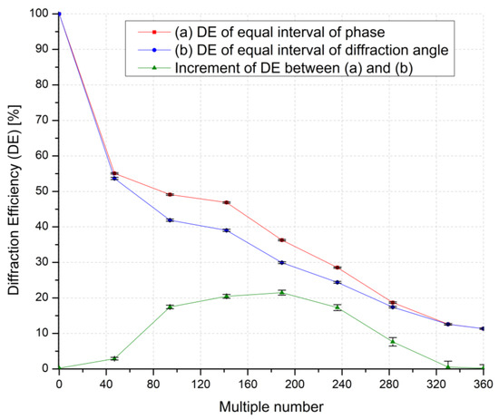 Experimentally measured DE of a LC BD as a function of the multiple number (n) and the difference between (a) equal interval of phase, (b) equal interval of diffraction angle, and the increment of DE between (a) and (b). The results of measuring a large number of DE were expressed as average values, and error bars were added based on the error data from these measurements.