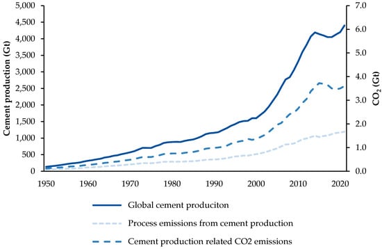 Global cement production and the associated CO2 emissions have steadily grown over the past few decades, driven by rising populations, accelerating urbanisation rates and increasing infrastructure development needs worldwide, except for temporary declines during eras of economic crisis (Figure 1). Projections indicate that global cement demand will increase by 12–23% by 2050 compared to 2020 [8]. Similarly, in the United Kingdom (U.K.), a 4.6% growth in cement demand is expected by 2030 [9]. Given the anticipated growth trajectory and the global agenda to achieve net zero emissions by 2050, there is a critical imperative to significantly reduce CO2 emissions from cement manufacturing by 24% by mid-century [7].