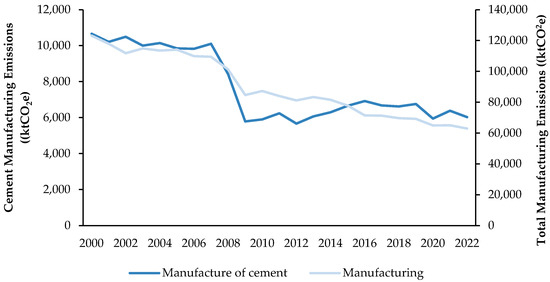 Cement manufacturing in the U.K. has remained relatively stable since an initial decline following the 2008 economic crash, unlike the broader manufacturing sector, which has experienced a declining trend over the past two decades [12,13]. The cement industry produces around 9 million tonnes of cement annually [14], emitting approximately 7.3 million tonnes of CO2 annually [15]. Unlike the broader manufacturing sector, the cement industry has demonstrated a lower rate of decline in emissions. Despite reducing emissions by 53% since 1990 and decarbonising at a faster rate than the U.K. economy overall [16], emissions have trended upward since 2009. This increase is driven by heightened industry stability and growing construction demands, leading to a rise in cement production (Figure 2).