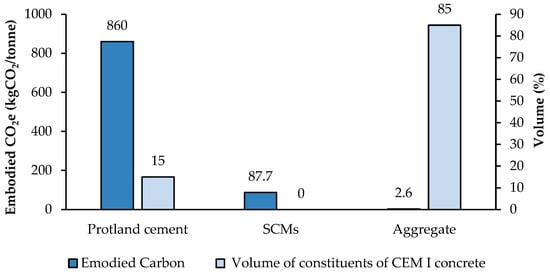 Concrete manufacturing involves blending cement with water and aggregates. Figure 6 presents the embodied emissions of typical constituents of concrete, as well as the volume of constituents in a CEM I concrete. It is evident that the portion of Portland cement contributes significantly to emissions despite its fractional use. SCMs, which act as substitutions for cement in other, less utilised concretes, embody approximately one-tenth of the carbon emissions. Therefore, Portland cement substitution by SCMs can significantly reduce CO2 intensity from cement production even by 75% [36].