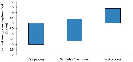 Figure 7 presents the range of energy consumption for each method. The most common approach, as the literature indicates, is the dry method. This method is preferred due to its lower carbon dioxide emissions, reduced fuel consumption, lower production costs and shorter processing times [39]. Despite its prevalence, resource constraints and environmental sustainability challenges persist, prompting research into more sustainable practices and technologies [40,41,42]. However, the lack of precise data on energy consumption and emissions introduces uncertainty in calculations, particularly for life cycle assessments (LCAs). This uncertainty can impact the accuracy of environmental impact evaluations, potentially underestimating or overestimating the benefits of specific methods. More robust and reliable data collection is essential to ensure that LCA results reflect the environmental implications of different production methods, thereby guiding better-informed decisions for sustainable practices.