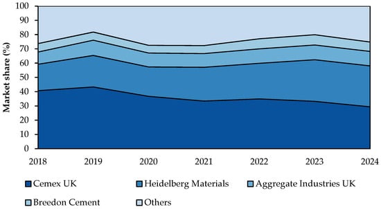 In fact, CEM I is the primary type of cement produced in the U.K., representing 79% of all cement produced in the market in 2021 [49]. The five largest cement manufacturers in the U.K. are Cemex U.K., Heidelberg Materials U.K., Aggregate Industries U.K. and Breedon Cement, which account for 75% of the market, as presented in Figure 10. They are subsidiaries of multinational parent companies, with their headquarters and research centres located overseas, mainly in Europe. Together, they operate a total of 11 kiln sites nationwide [50,51].