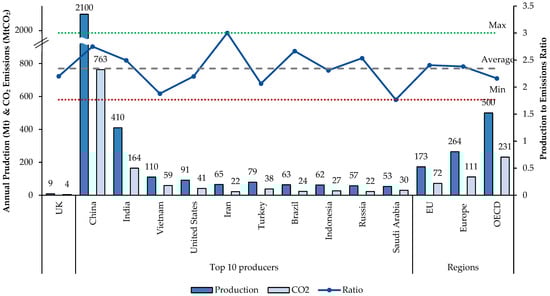 Production and emissions as well as their ratio in 2022 for the U.K., the top 10 cement-producing countries and regions associated with the U.K. A higher ratio equates to better performance. Data compiled from [21,22,52,53,54,55].