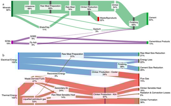 Sankey diagrams of the (a) material and (b) energy flows. Input values are from sources pertaining to the U.K. cement sector, while the subsequent distribution of flows throughout the processes is computed from average processing data found in the literature. Data compiled as follows: For (a), material inputs from [54] and material consumption from [55]. For (b), energy inputs from [56] and energy distribution averages from [57,58,59,60,61].