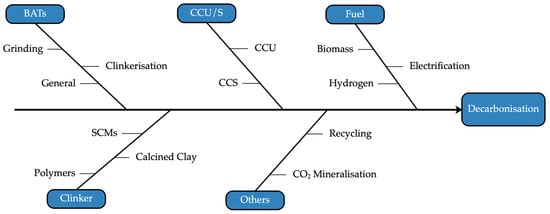 The review commenced by contextualising the industry’s production dynamics through mapping cement varieties and manufacturing processes. Afterwards, a characterisation of the U.K.’s cement sector took place; this included the examination of market performance and emissions profile, emphasising the material and energy flows unique to the sector. This foundational understanding sets the stage for exploring decarbonisation strategies in depth. The investigation transitions from broad contextual analysis to specific approaches, which were categorised into key decarbonisation strategies: (1) BATs, (2) fuel switching, (3) CCUS, (4) clinker substitution and (5) emerging innovations. Each pathway was assessed for technological readiness, environmental impact, cost and validity aspects that govern its large-scale deployment prospects within the U.K. cement sector. This approach ensured that the findings were accessible and actionable for both academic and industry stakeholders. Lastly, the findings were used to build the bases for a decarbonisation roadmap specific to the cement sector in the U.K., framed by the interplay of technological viability and stakeholder engagement.